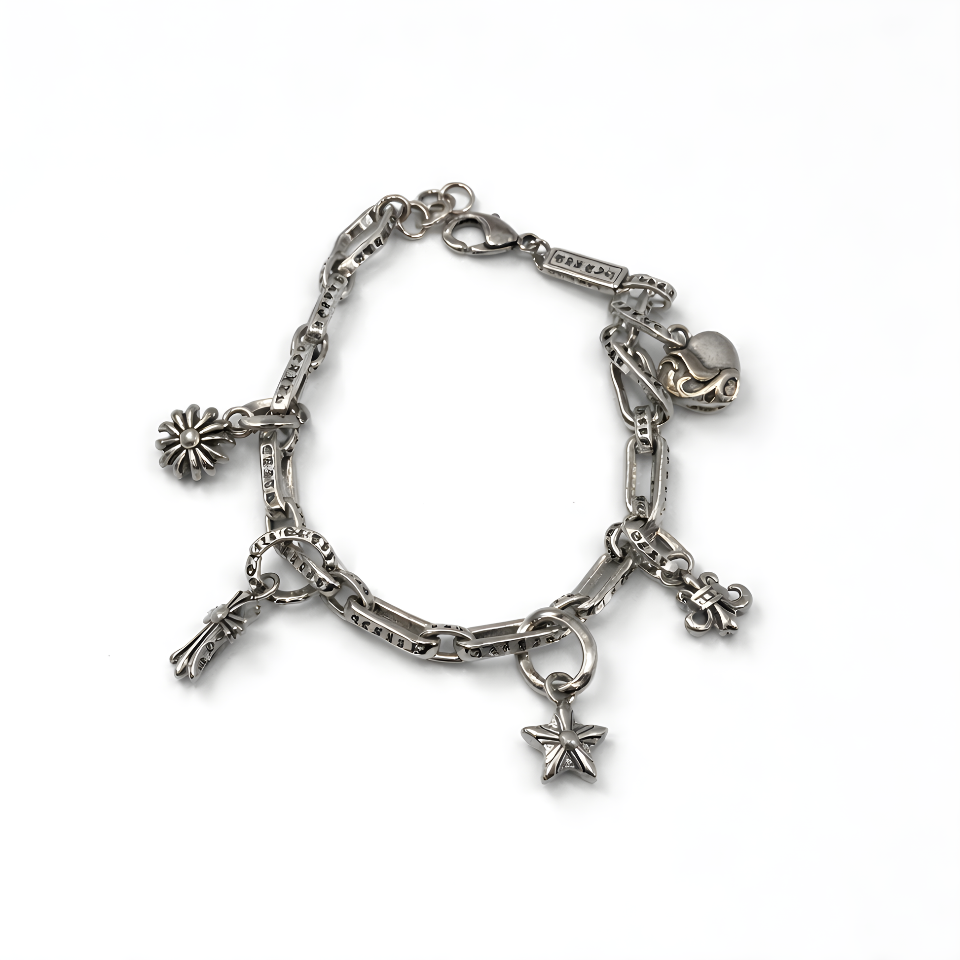 Statement piece, Unique symbolic charms design ,Sterling Silver plated brass, Adjustable length. Unisex bracelet.