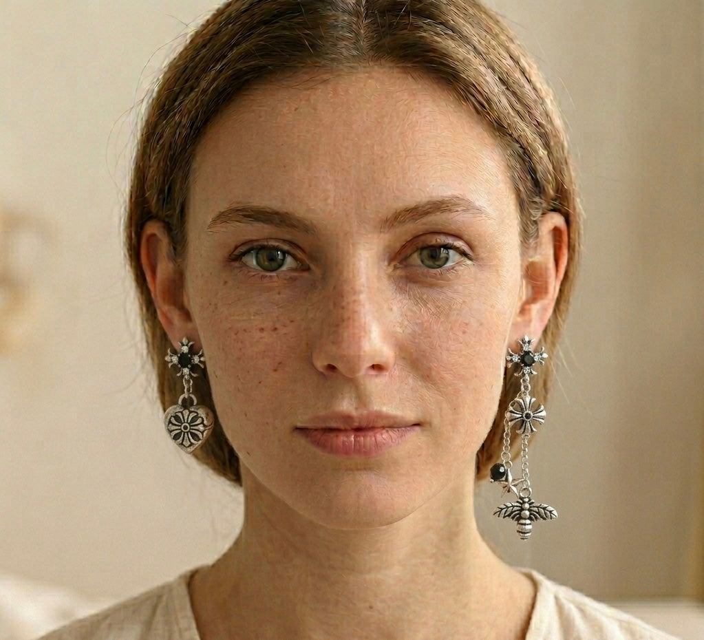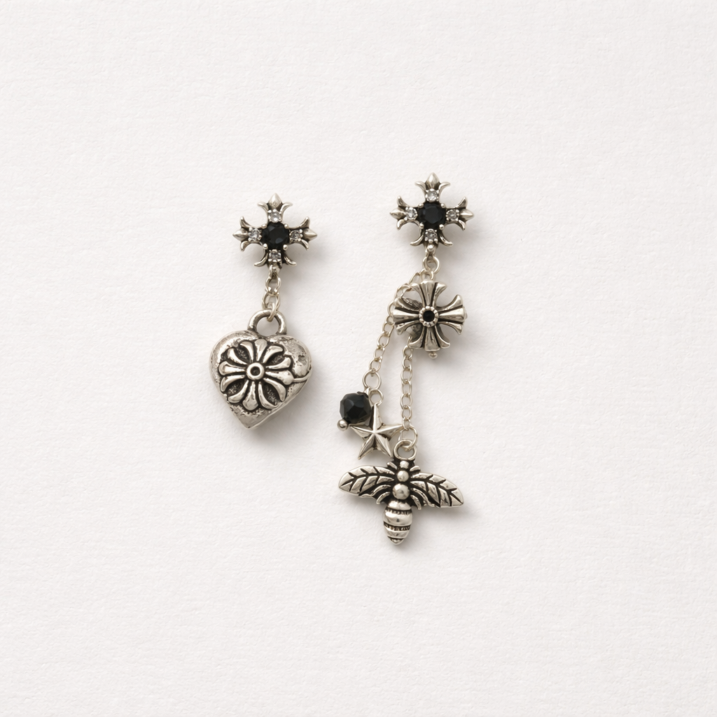 Asymmetrical Design: Bold contrast between a sculpted heart and a dangling honeybee.
